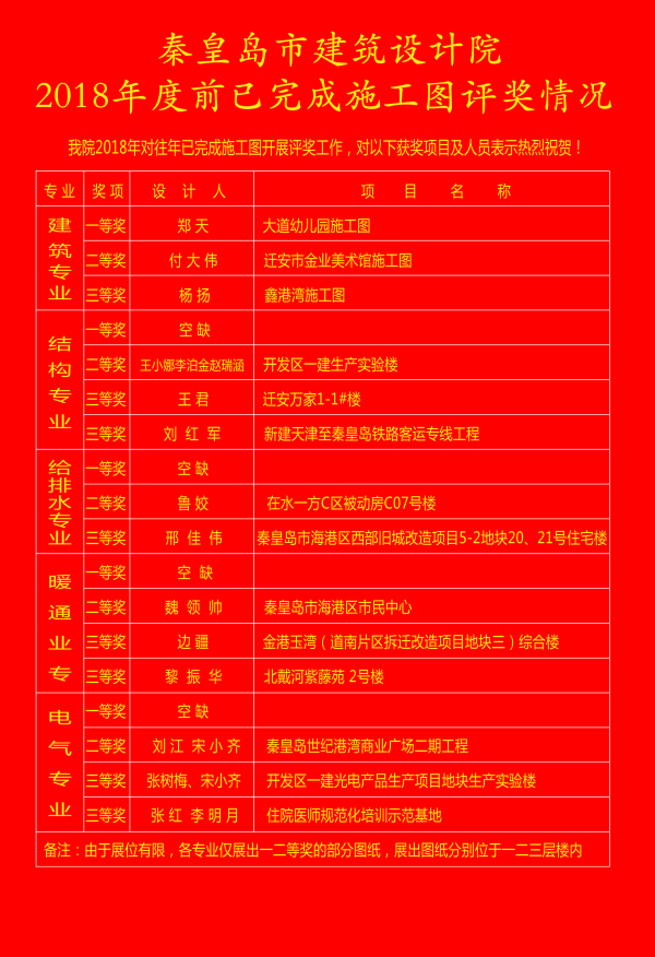 截止到2018年3月5日,活動最終按照各專業(yè)分別評選出了一、二、三等獎,評選結(jié)果和獲獎的優(yōu)秀施工圖分別在大堂進(jìn)行了公示。